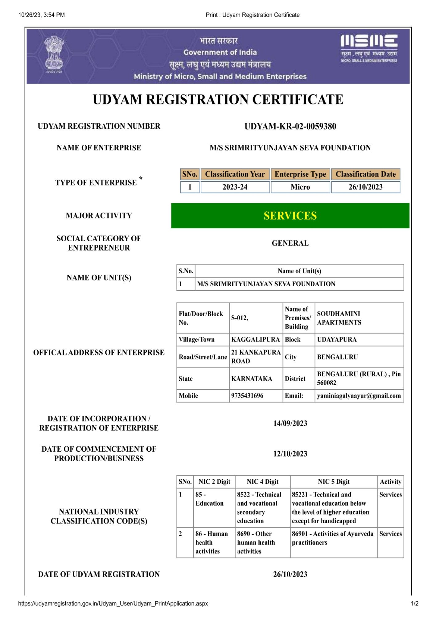 Udyam Registratio Number UDYAM-KA-02-0059380